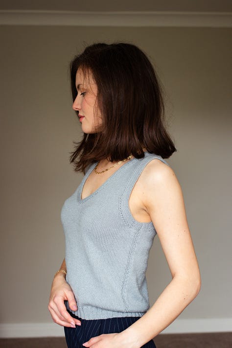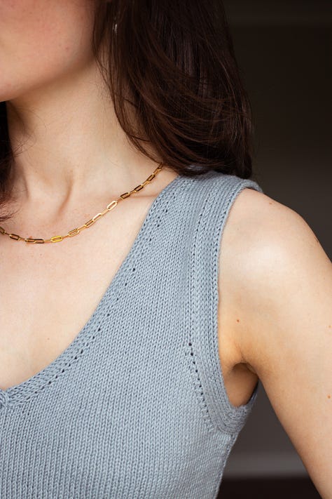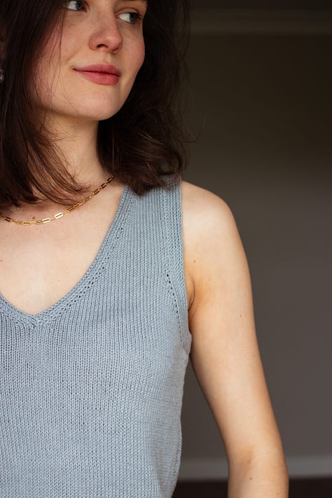 Iâd recently finished my Calm Down Sweater when planning designs for Summer, so pinching its double knit neckband to sit alongside the double knit armhole edgings seemed only logical. Both feature integrated short row shaping to improve the fit - you canât wrap a flat piece of fabric around a corner and expect it to lie flat, after all. And edgings that donât lie flat might just be my biggest knitting bugbear of all time.
